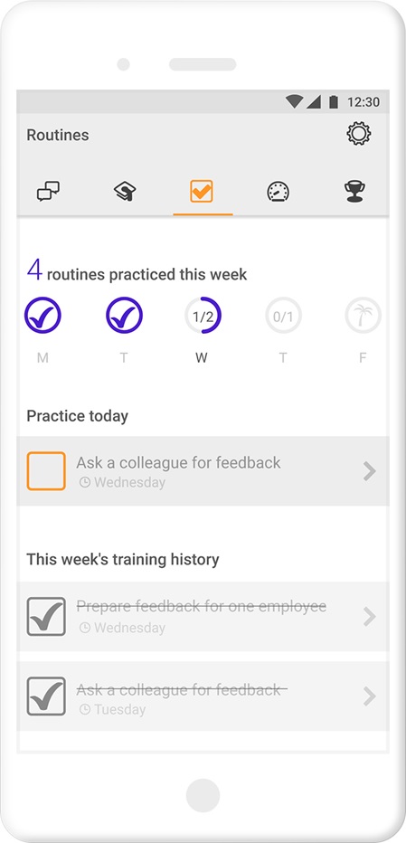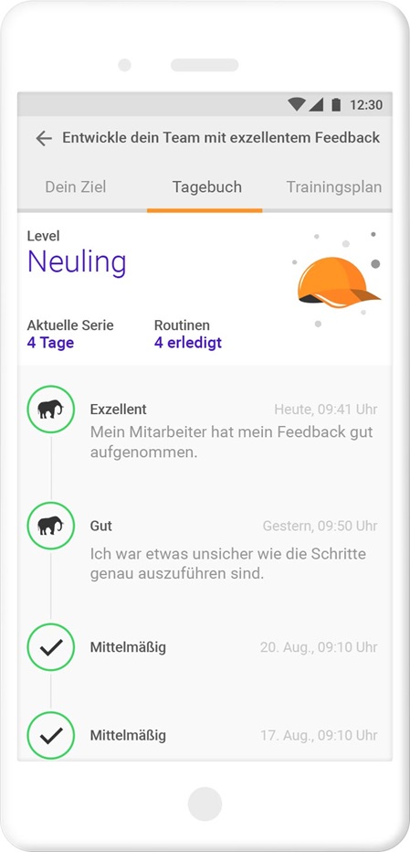 Mit der everskill App führen Seminarteilnehmer ein persönliches Lerntagebuch. Sie reflektieren ihren täglichen Fortschritt in der Anwendung neuen Wissens. Schritt für Schritt erreichen die Teilnehmer so ihre Ziele.